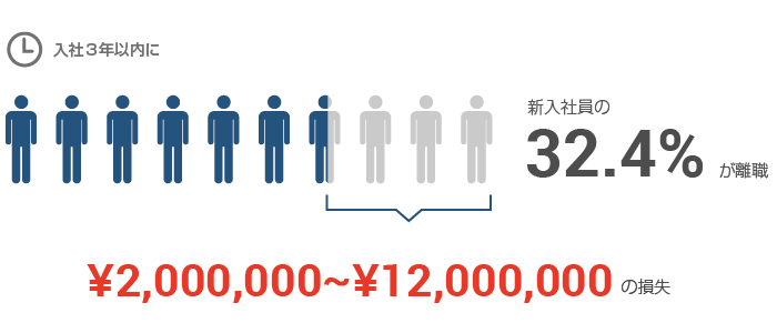 現在、どれだけ能力の高い新入社員が入社してもその32.3%は3年以内に離職してしまうという統計があります。新人の教育にはお金も時間も大いにかかり、その損失額は離職者の勤続年数にもよって異なるものの、社員一人につき200〜1200万円とも計算されています。