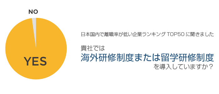 実際に2016年現在、離職率が低い企業ランキングTOP50のうち98%が海外研修制度または留学研修制度を導入しています。※当社調べ